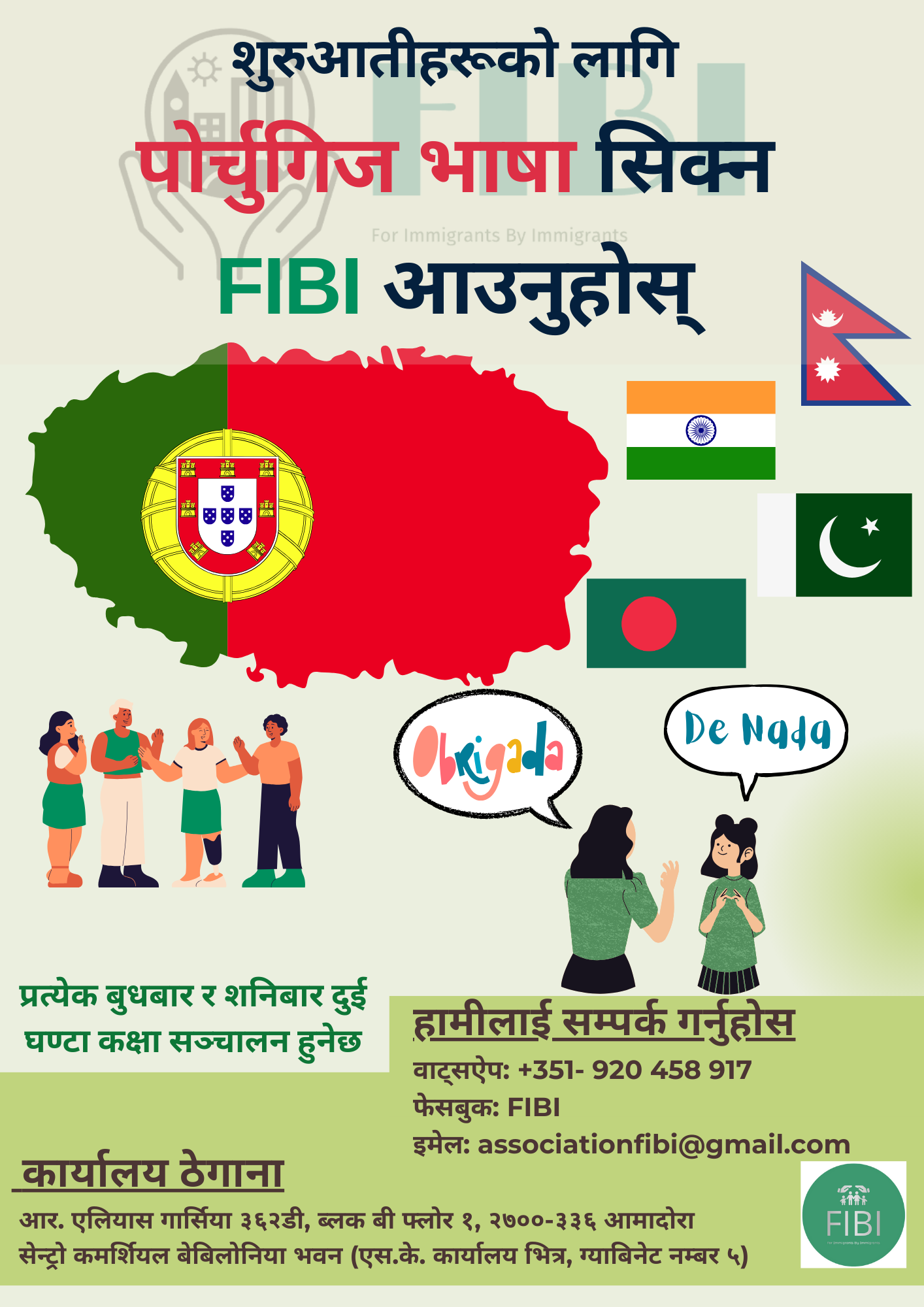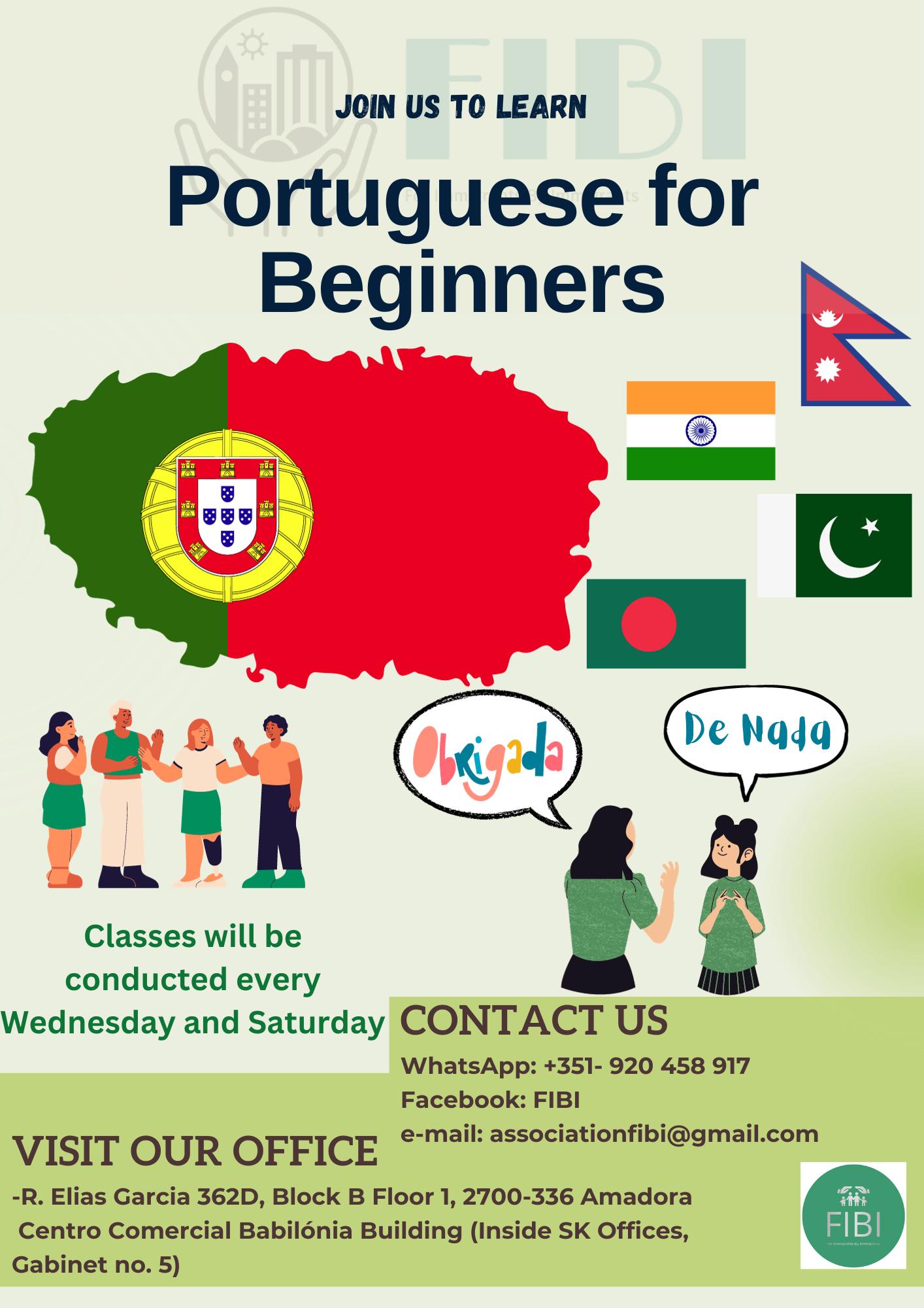 Ready to enroll?We hope to meet you soon शुरुआतीहरूको लागि पोर्तुगिस भाषा सिक्न FIBI आउनुहोस् +351 920 458 917 portuguese for beginners Basic Portuguese Language Course Our comprehensive Portuguese language program is designed to make your learning experience not only educational but also enjoyable. Why Choose Us? Qualified InstructorsInteractive ClassesCultural EnrichmentUp to date Syllabus What You Will Learn Conversational SkillsGrammar MasteryCultural InsightsReal-Life Applications Class Hours Classes will be conducted every Wednesday and Saturday(2 hours a day) Register Online Fill up the form below if you are interested in basic Portuguese language course. Register Now